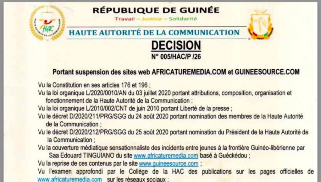 Guinée : La HAC suspend deux sites d’information et deux journalistes...
