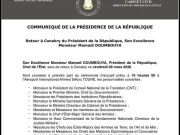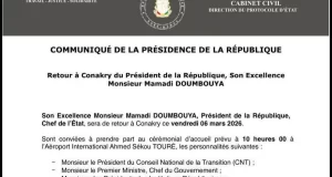 La Présidence de la République de Guinée annonce le retour imminent du chef de l’État, le général Mamadi Doumbouya, à Conakry ce vendredi 6...