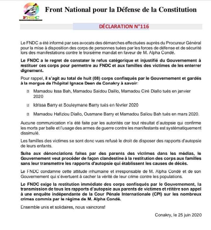 Le FNDC a le regret de constater le refus catégorique et injustifié du Gouvernement à restituer ces corps pour permettre au FNDC et aux familles des victimes de les enterrer dignement. Pour rappel, il s’agit au total de huit (08) corps confisqués par le Gouvernement et gardés à la morgue de l’hôpital Ignace Deen de Conakry à savoir: Mamadou Issa Bah, Mamadou Saidou Daillo, Mamadou Ciré Diallo tués en janvier 2020, Idrissa Barry et Souleymane Barry tués en février 2020 Mamadou Hafiziou Diallo, Ousmane Barry et Mamadou Saliou Bah tués en mars 2020.
