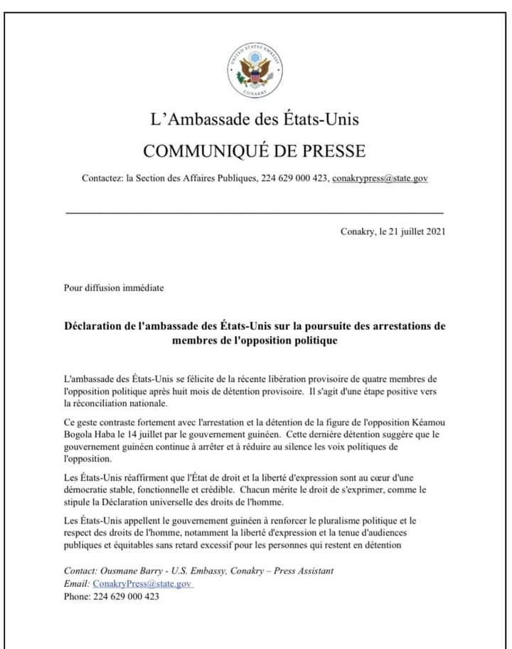 Ce geste contraste fortement avec l’arrestation et la détention de la figure de l’opposition Kéamou Bogola Haba le 14 juillet par le gouvernement guinéen. Cette dernière détention suggère que le gouvernement guinéen continue à arrêter et à réduire au silence les voix politiques de l’opposition.