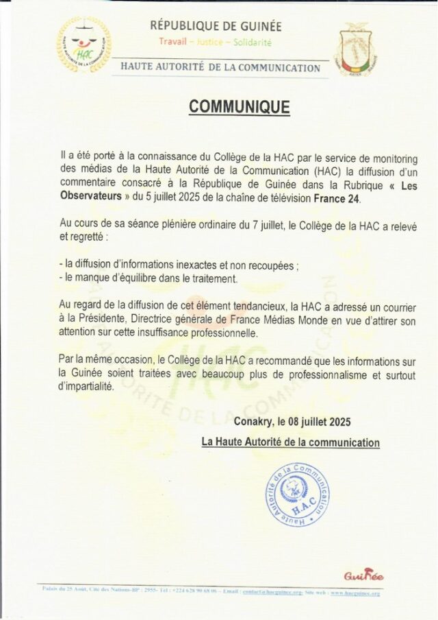 Home A LA UNE La HAC monte au créneau contre un reportage ... A LA UNEActualitésCultureÉconomieOpinionPolitiqueSociété La HAC monte au créneau contre un reportage de France 24 sur la Guinée By diallo - 8 juillet 2025 0 SHARE Facebook Twitter La HAC monte au créneau contre un reportage de France 24 sur la situation politique de la Guinée. (Communiqué)