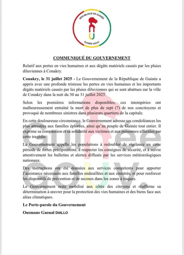 Le Gouvernement de la République de Guinée a appris avec une profonde tristesse les pertes en vies humaines et les importants dégâts matériels causés par les pluies diluviennes qui se sont abattues sur la ville de Conakry dans la nuit du 30 au 31 juillet 2025.