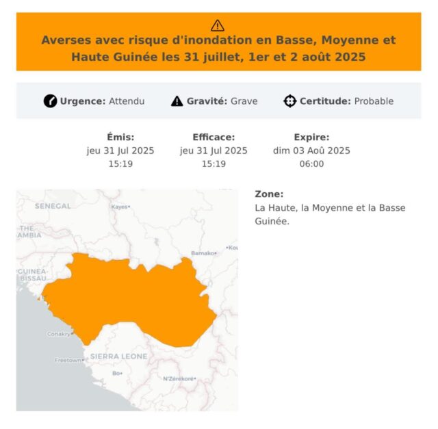 Risques élevés d’inondation dans les prochaines 72 heures en Basse, Haute et Moyenne Guinée (Alerte ANM)