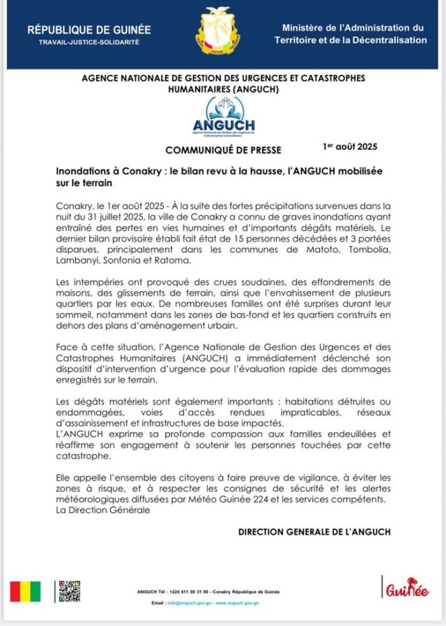 Selon l’ANGUCH, une pluie dalinienne à Conakry dans la nuit du 30 au 31 juillet a provoqué des inondations qui ont coûté la vie à 15 personnes et 3 disparus. A cela, s’ajoutent d’énormes dégâts matériels.