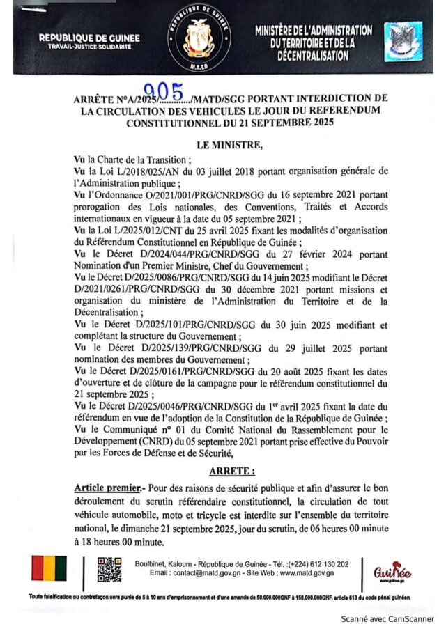 Guinée/référendum.La Circulation des véhicule est interdite le 21 septembre 2025 de 6h à 18h sur toutes l’étendu du territoire national seuls les véhicules de défense, ambulances et secours sont autorisés à circuler. (MATD)