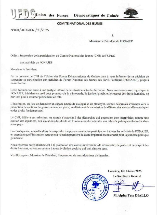 Le Comité National des Jeunes (CNJ) de l’Union des Forces Démocratiques de Guinée (UFDG) a annoncé la suspension de sa participation aux activités du Forum National des Jeunes des Partis Politiques (FONAJEP)