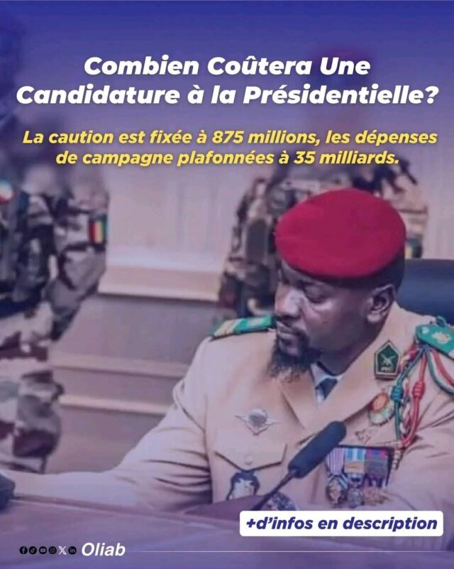 Le montant de la caution, c’est-à-dire la somme que chaque candidat doit déposer pour que sa candidature soit validée, a été fixé à 875 millions de francs guinéens (GNF). Cette somme doit être versée au Trésor public.