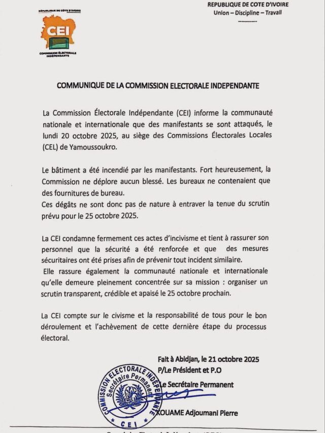 Côte d’Ivoire : des manifestants ont incendié, lundi 20 octobre 2025, le siège de la Commission électorale locale (CEL) de Yamoussoukro, a indiqué la Commission électorale indépendante (CEI) dans un communiqué publié mardi 21 octobre.