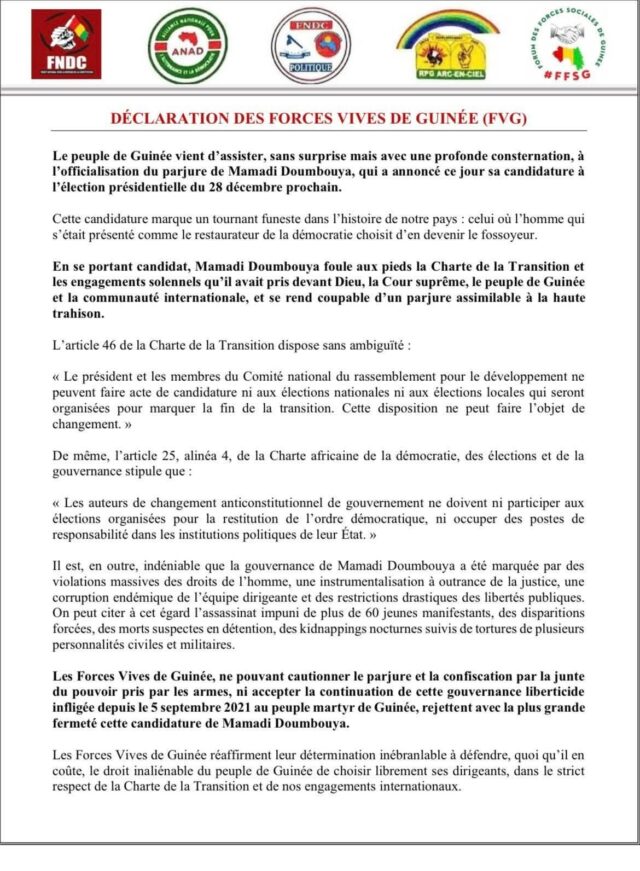 Dans une déclaration,les Forces Vives de Guinée ont rejeté la candidature du Général Mamadi Doumbouya.