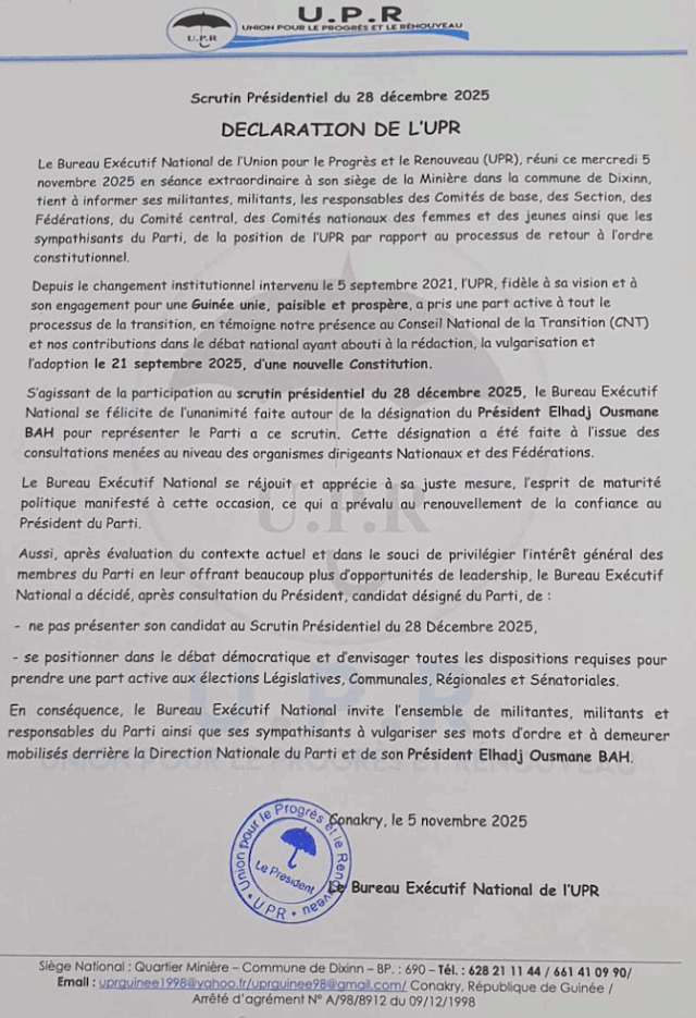 Dans une déclaration, le président de l’UPR, Bah Ousmane a écarté sa candidature à la présidentielle guinéenne du 28 décembre prochain