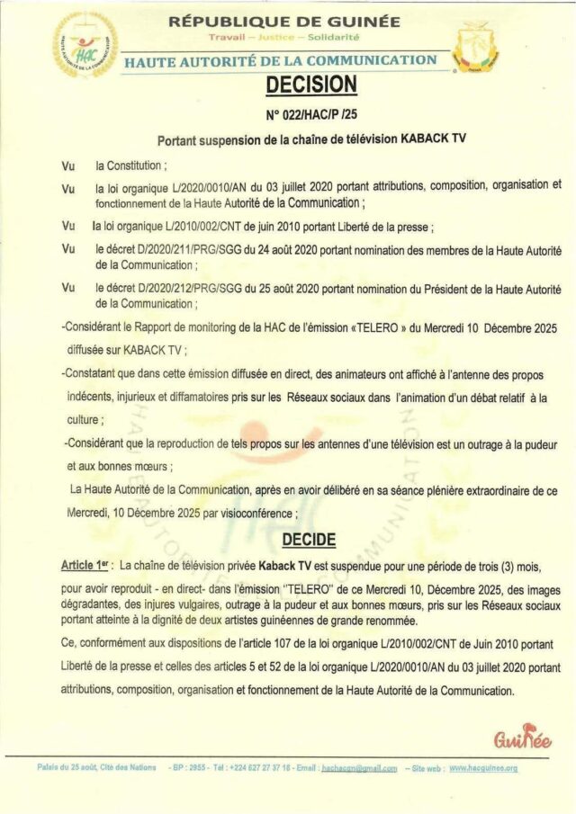 Guinée: La HAC décide de suspendre la diffusion de la chaîne de télévision « Kaback Tv».