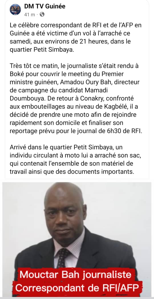Conakry: Mouctar Bah, journaliste de RFI, AFP et RSF, a été victime d’un vol à l’arraché, ce samedi 23 décembre à Petit-Simbaya