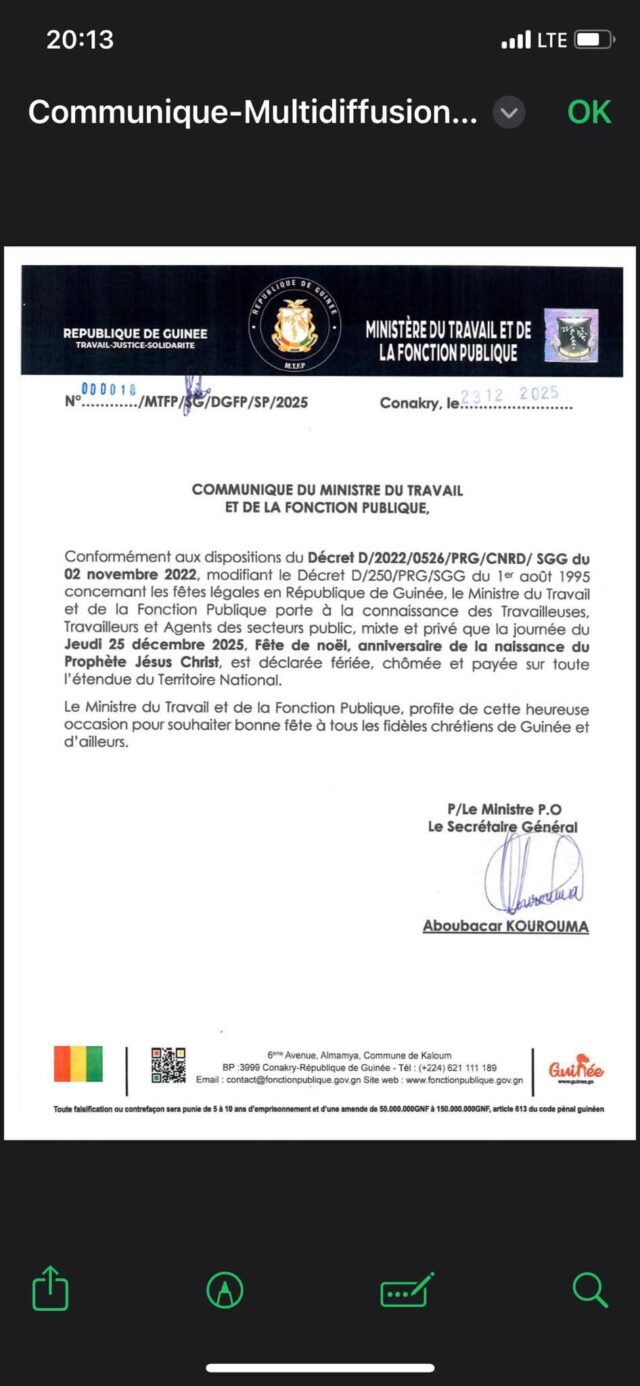 Home Actualités Guinée: la journée de demain jeudi 25 décembre, déclarée, chomée et payée... ActualitésCultureÉconomieOpinionPolitiqueSociété Guinée: la journée de demain jeudi 25 décembre, déclarée, chomée et payée (Ministère de la Fonction Publique et du Travail) By diallo - 24 décembre 2025 0 SHARE Facebook Twitter Voir le communiqué vi dessous: