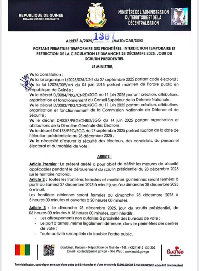 Dans une décision d’urgence prise ce samedi 27 décembre 2025, le Ministre de l’Administration du Territoire et de la Décentralisation a annoncé la fermeture temporaire de toutes les frontières terrestres et maritimes du pays.