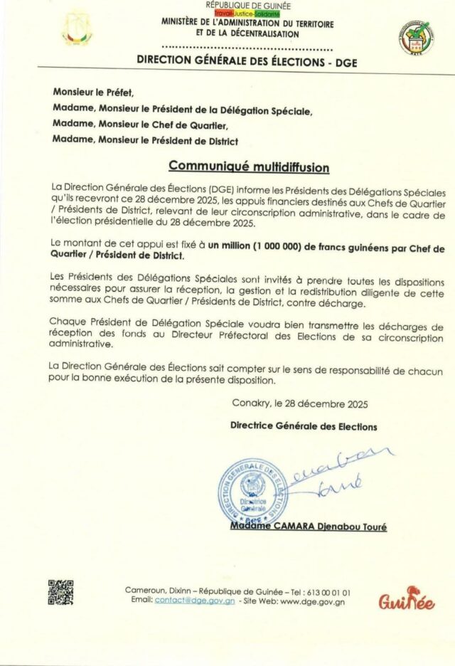 Guinée/Présidentielle: la direction générale des élections annonce un décaissement d’appui aux chefs de quartiers et districts