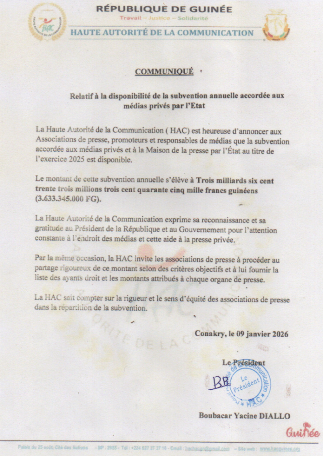 La Haute Autorité de la Communication (HAC) a annoncé ce vendredi 9 janvier 2026 la mise à disposition de la subvention annuelle destinée aux médias privés et à la Maison de la presse pour l’exercice 2025.