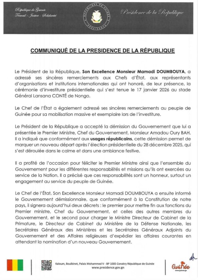 Home A LA UNE Guinée: le Gouvernement de Bah Oury a rendu sa démission, ce jeudi... A LA UNEActualitésCultureÉconomieOpinionPolitiqueSociété Guinée: le Gouvernement de Bah Oury a rendu sa démission, ce jeudi 22 janvier (Présidence) By diallo - 22 janvier 2026 0 SHARE Facebook Twitter Guinée: le Gouvernement de Bah Oury a rendu sa démission, ce jeudi 22 janvier (Présidence)